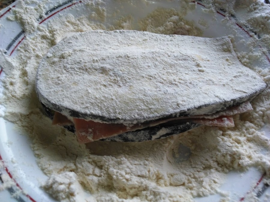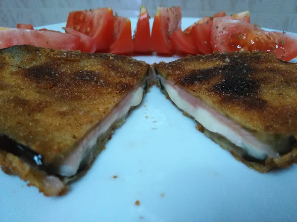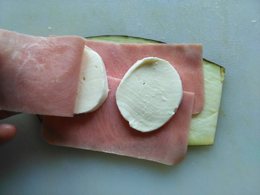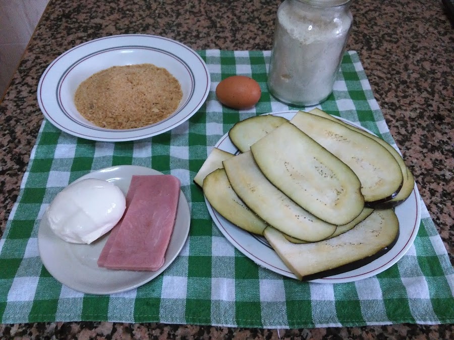 El orden es, filete de berenjena, jamón york o serrano, queso y de nuevo jamón, por último ponemos otro filete de berenjena y apretamos bien