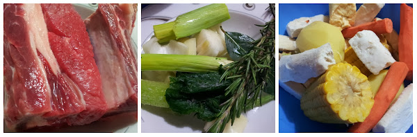 En una olla suficientemente grande o en la olla a presión, ponemos el agua y las costillas precedentemente lavadas, agregamos los tallos de cebolla larga, la cebolla cabezona, el apio, el romero y el ajo.