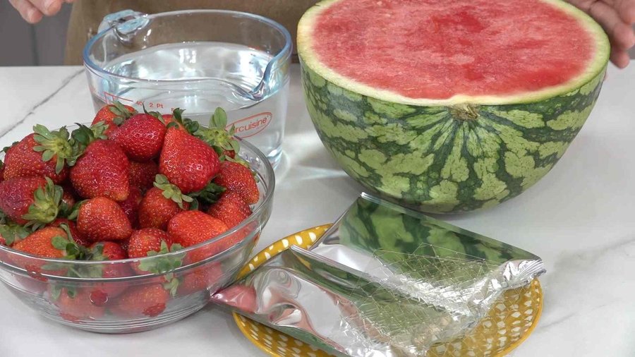 - Lo más importante es comprobar que no haya ninguna grieta o raja en la cáscara de la sandía, porque si se escapa el líquido por ahí no va a ser posible realizar la receta.- Aunque interesa que las fresas no estén verdes, tampoco deben estar demasiado maduras, porque si están muy blandas afectarán a la textura del postre.