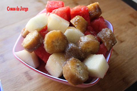 He encontrado en la nevera un plátano extremadamente maduro, que había que consumirlo ya, aunque como podéis observar en la foto estaba muy feo, mezclado con sandía y melón quedo rico.