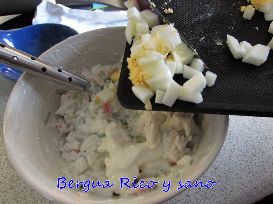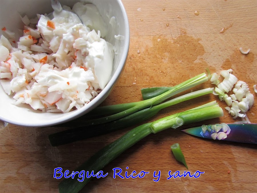 2. Mezclamos el surimi picado con la cebolleta y el huevo. Después añadimos el yogur y mezclamos bien.