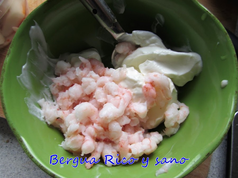 2. Mezclamos el queso cremoso con el yogur y las gambas picadas.