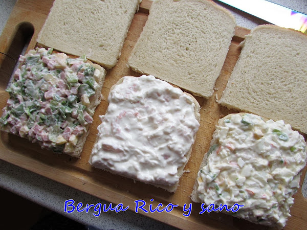 Aquí tenemos 3 rellenos diferentes y suficiente para 2 sándwiches de cada; es decir, 6 sándwiches; 12 triángulos en total.