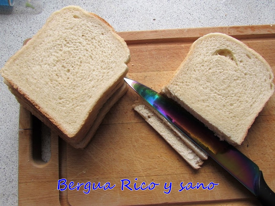 Aquí en Dinamarca es muy difícil encontrar el tipo de pan requerido, y es que el pan blanco se considera casi un veneno; así que hay mucha más variedad de pan integral y de centeno. Pero conseguí un buen pan de molde firme y tierno. Eso sí, con corteza, pero bueno, retiré la corteza con cuidado y la aproveché para otras recetas. Personalmente a mí me gusta la corteza, pero quería que el resultado final recordara a los de Rebeca.