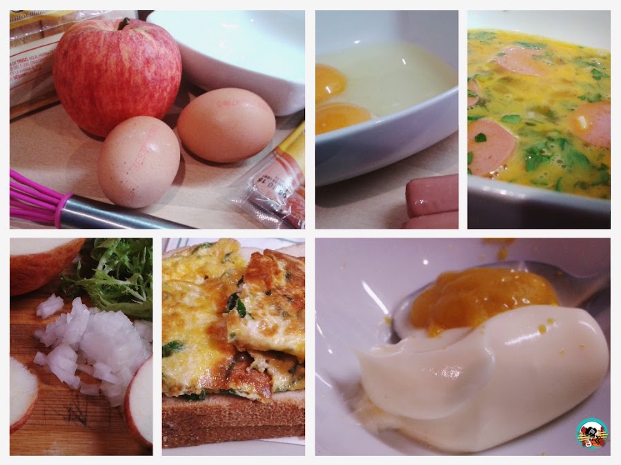 1 huevo por persona, 1 salchicha de nuestro gusto.