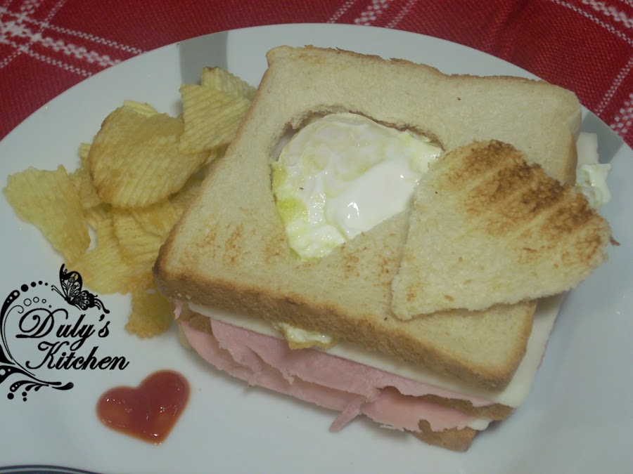 10- Por último se coloca otra rebanada como tapa. En mi caso como lo estoy adaptando un poco voy a cortar un hueco en la zona donde está la yema del huevo.