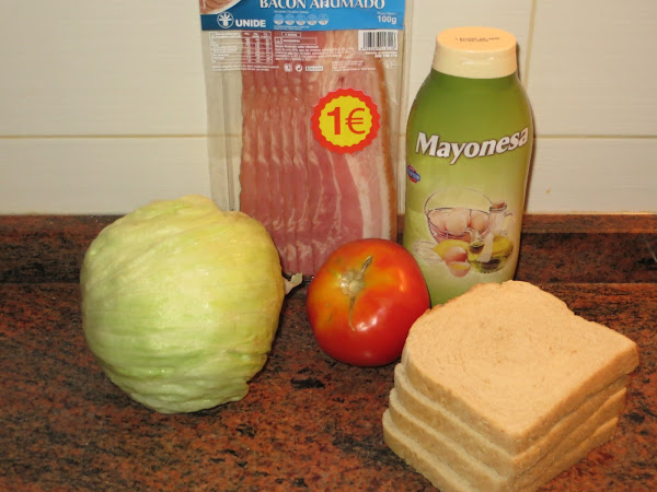 Ahora tostamos el pan, untamos una de las caras del pan de mayonesa, colocamos encima un par de hojas de lechuga, tres rebanadas de tomate, tres lonchas de bacon, untamos la otra rebanada del pan de mayonesa y la colocamos encima y ya está listo para comer. Se puede acompañar con una rica ensalada o con patatas fritas.