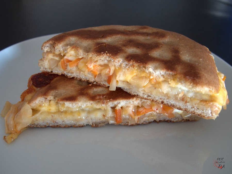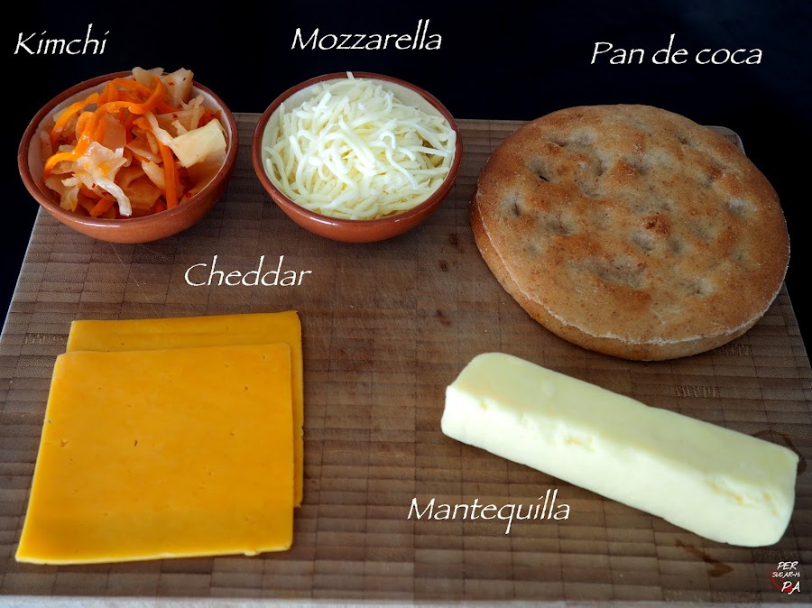 Hemos utilizado un pan de coca casero (podéis ver la receta aquí) , pero cualquier pan artesano nos dará buen resultado. Repartir la mitad de la mezcla de quesos sobre la base del pan y colocar encima el kimchi. Cubrir con el resto de la mezcla de quesos y cerrar el sandwich con la otra mitad del pan.