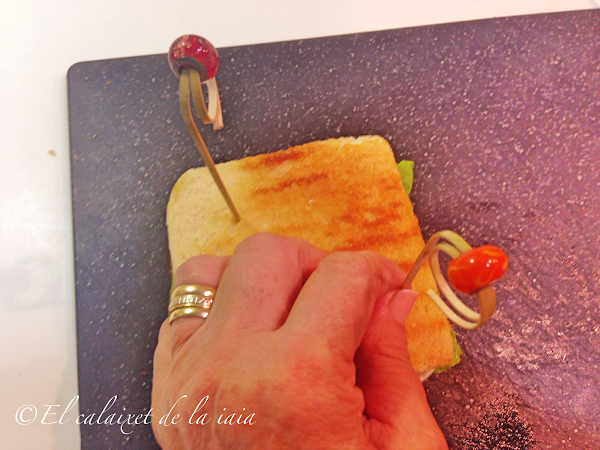 Presionamos el sándwich con la mano y pinchamos con un par de palillos para que quede sujeto