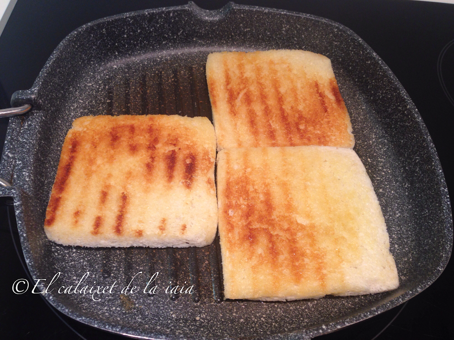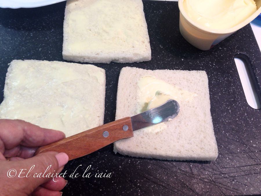 Untamos el pan por ámbas caras con mantequilla ligeramente, os recomiendo que no pongáis mas que la mantequilla imprescindible.