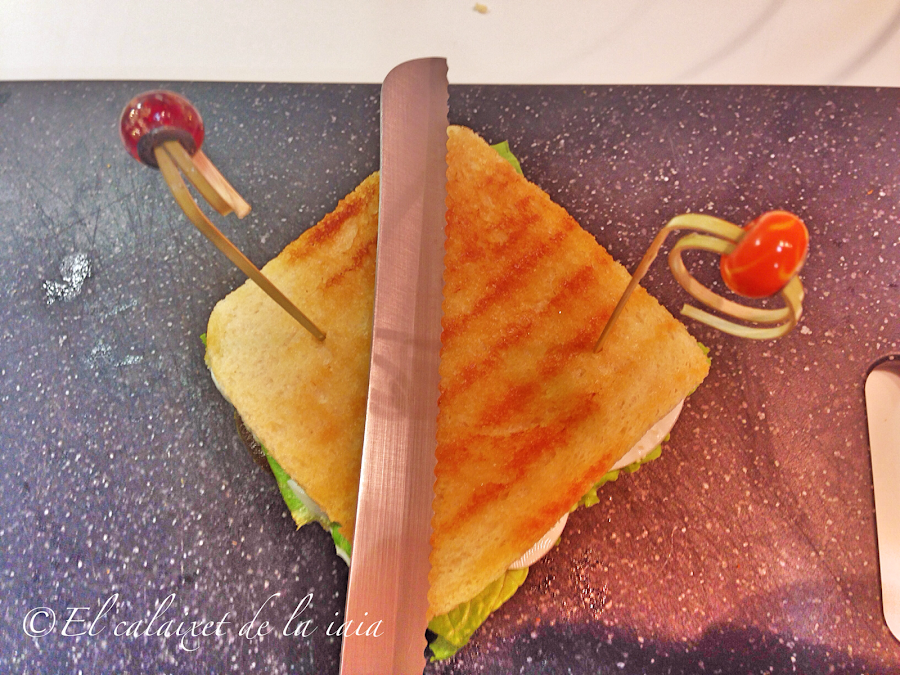 Cortaremos por la mitad haciendo dos porciones, con un cuchillo de sierra. Si cortamos en cuatro porciones en lugar de dos, pondremos cuatro palillos, uno en cada esquina, para no destrozar el sandwich