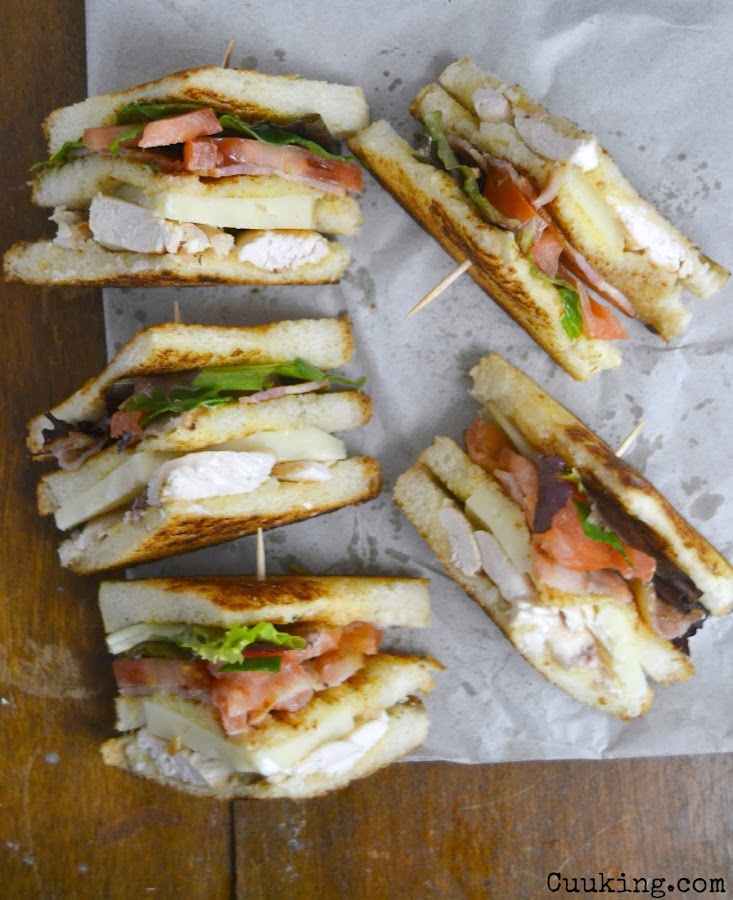 En la versión original no llevaba pollo si no jamón de York pero la la versión con pollo se ha hecho famosa gracia a una gran cadena de restaurantes americanos.Este sándwich es perfecto para una cena o comida informal y si lo acompañáis con algo de fruta de postre será una comida bastante completa ¡Además esta riquísimo!