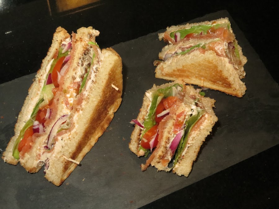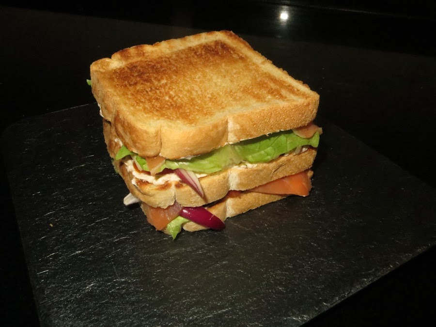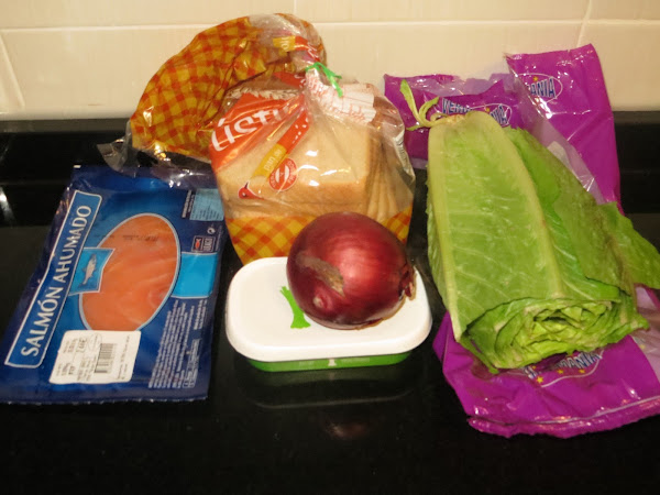 Lo primero que hacemos es tostar el pan, luego le untamos en la primera rebanada una capa generosa de queso y colocamos encima la lechuga lavada, el tomate y la cebolla en rodajas y una loncha de salmón ahumado. Cogemos una segunda capa de pan, la untamos con queso y colocamos la otra hoja de lechuga, rodajas de tomate y cebolla y una loncha de salmón ahumado. Cerramos, partimos en varios trozos y a comer.
