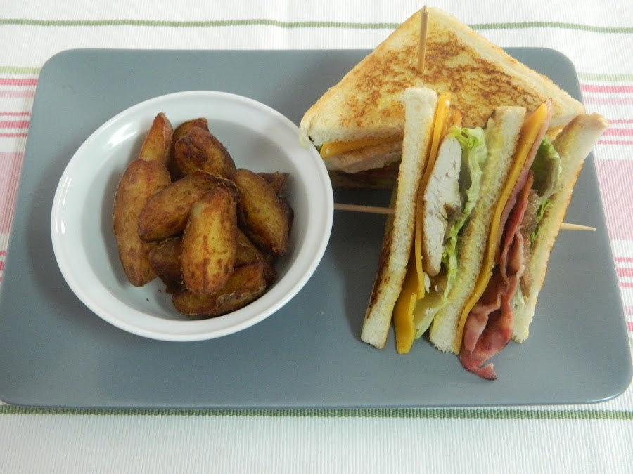 En dos de las tres rebanadas de pan, untamos la salsa y colocamos todos los ingredientes y acabamos con la última rebanada de pan.