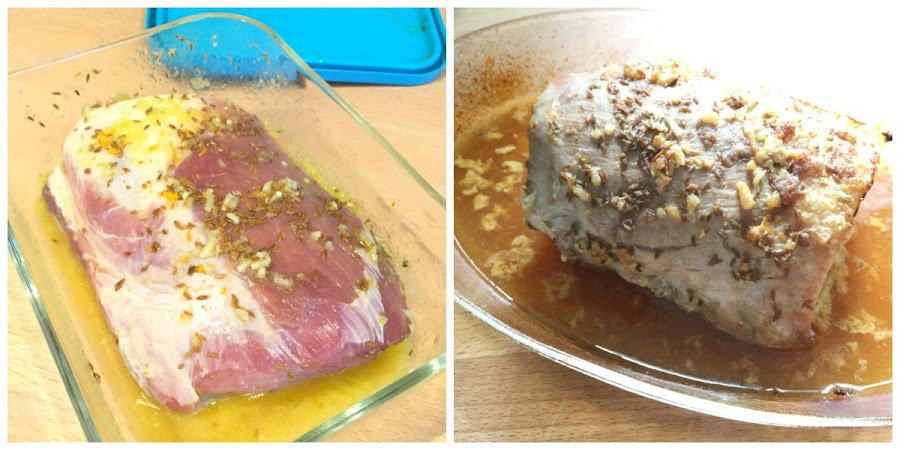 Se baña toda la carne con este aliño y se le pone sal a la carne. Se deja mínimo 8 horas. Yo lo dejé casi 24 horas, podéis ver la imagen de la izquierda, lo puse en un recipiente con tapa y lo metí en el frigorífico.