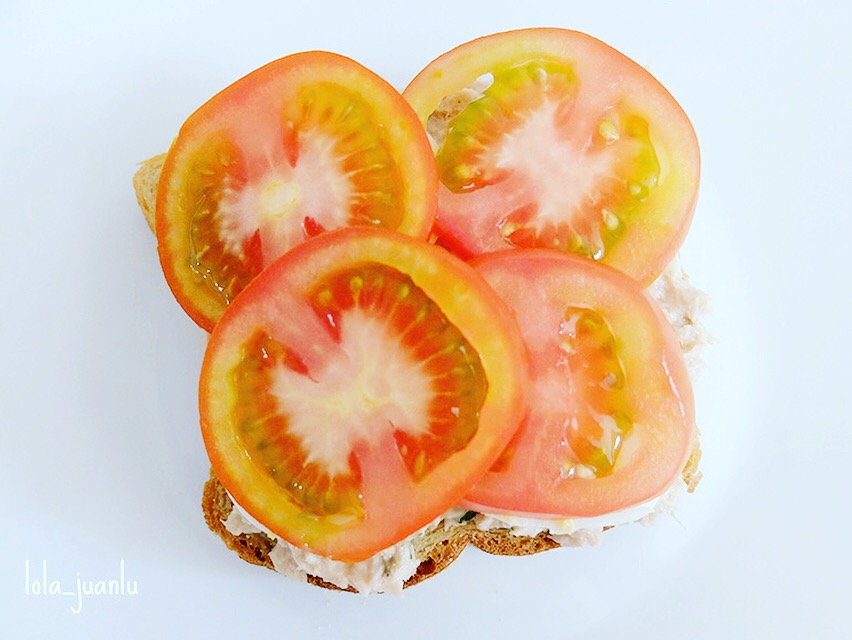 Colocamos cuatro rodajas de tomate y cubrimos con otra rebanada de pan.