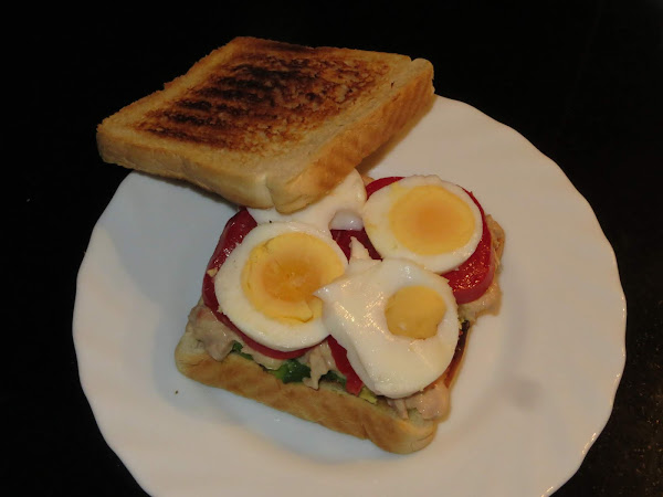 Ahora llega el momento de montar nuestro sándwich cogemos una rebanada de pan de molde que tendremos tostada y colocamos la mezcla de atún, luego el aguacate, el tomate y el huevo. Cerramos con otra rebanada de pan de molde y ya está listo para degustar.