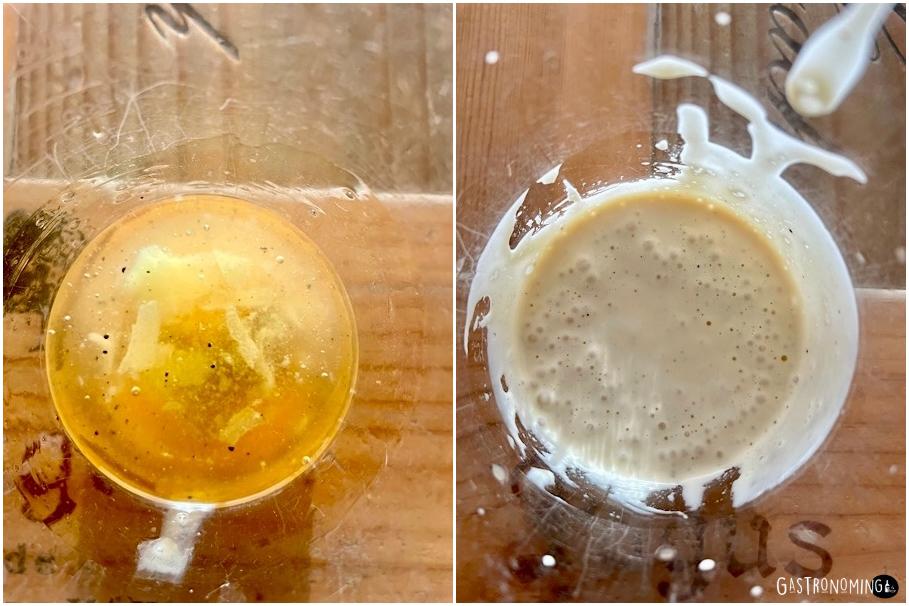 1. Si usamos una minipimer, ponemos todos los ingredientes en un envase y batimos hasta montar. Si usamos una licuadora, ponemos el huevo y la yema, zumo de limón, mostaza, aceite de oliva, sal y pimienta, batimos y vamos añadiendo el aceite poco a poco hasta montar. Reservamos en frío.Para los sándwiches: