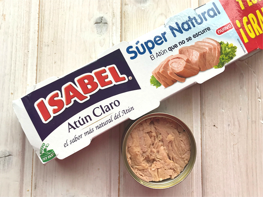 El atún claro Súper Natural de Isabel venía en la caja Disfrutabox de este mes, así que ha sido el que he utilizado. Es al natural (menos calorías, que ya no llego a la operación bikini, ni a la del año que viene), pero me ha encantado que la lata no venga llena de líquido sospechoso, sino solo de atún del bueno, que no me ha hecho falta ni escurrirlo. Tal cual se ve en la foto, así estaba al abrir la lata. Y eso, para señoras que tendemos al desastre cuando escurrimos una lata, es un punto extra.