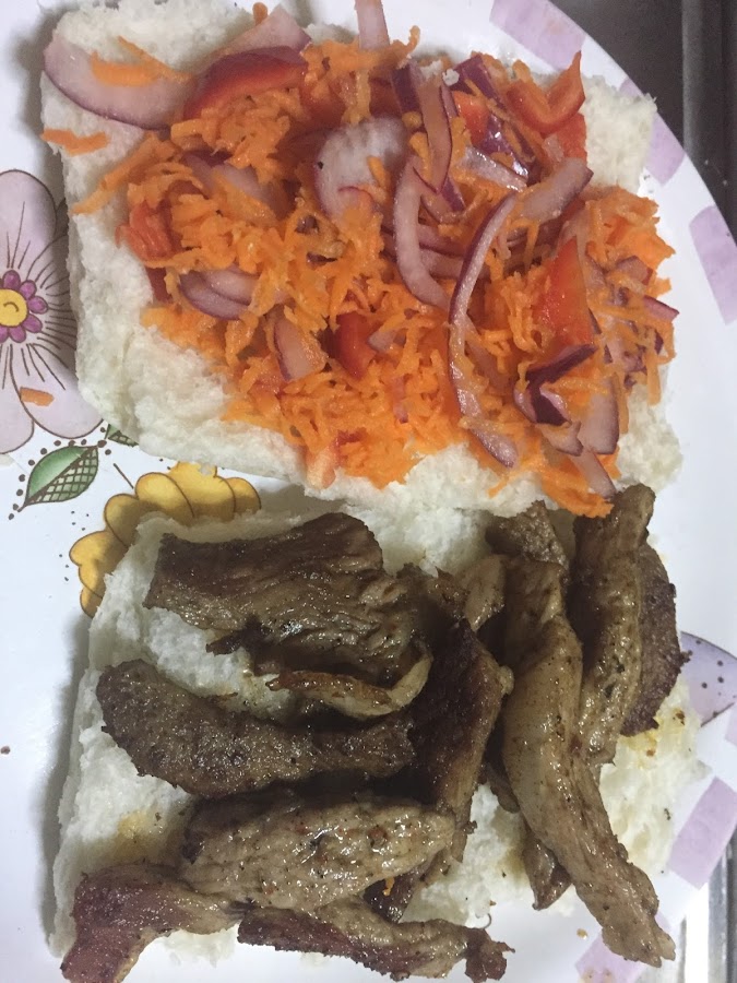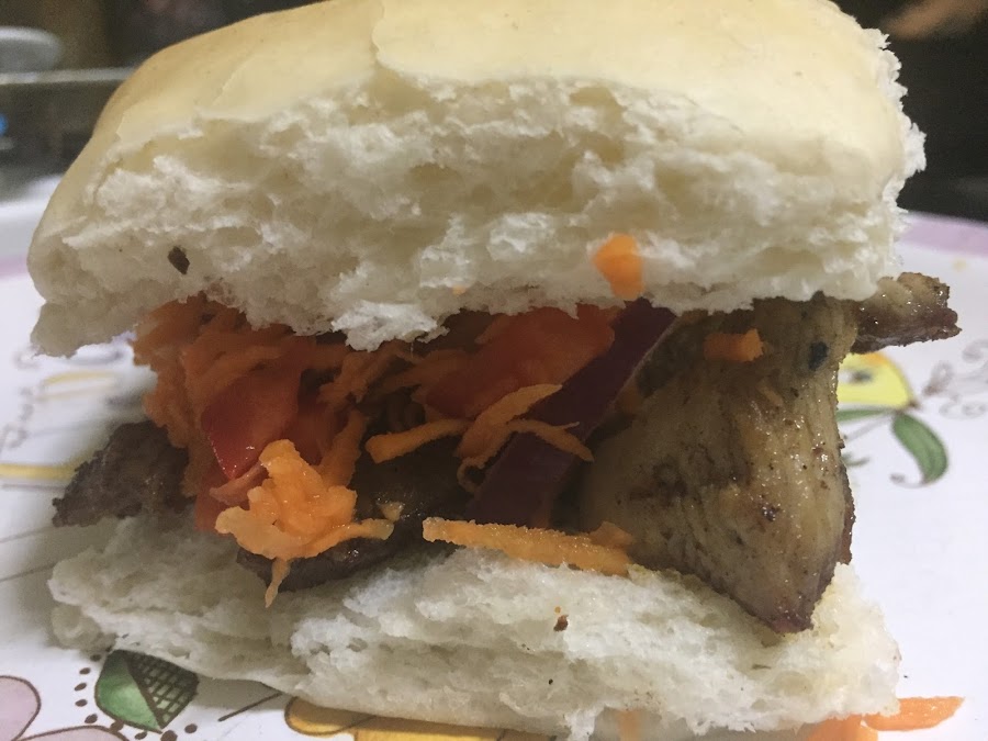 Para armar el sándwich partis al medio el pan , de una parte pones el cerdo y la otra el repollo o la zanahoria y listo