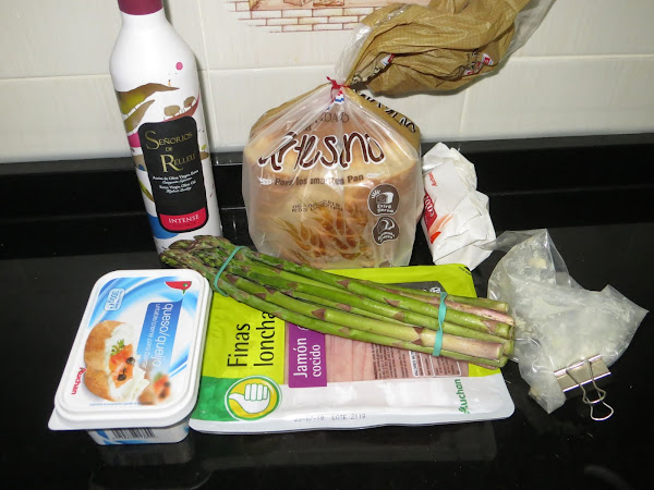 Ahora llega el momento de montar el sándwich, colocamos una rebanada de pan, encima untamos el queso crema, ponemos una loncha de jamón cocido, las rodajas de queso de cabra, encima los espárragos calientes y esparcimos un poco de queso azul. Untamos la otra rebanada de pan con queso crema y cerramos el sándwich.