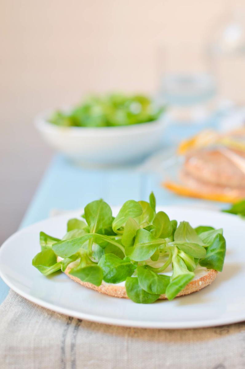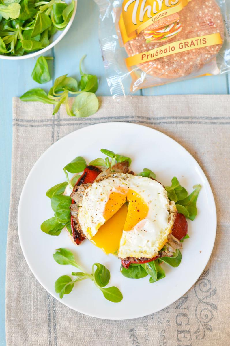 En hora de montar nuestro sándwich. En un plato ponemos la base de nuestro panecillo Thin de quinoa. Añadimos un poco de mayonesa o salsa de yogur, eso al gusto. Ponemos un buen puñado de canónigos. A continuación las setas, los pimientos y por último el huevo.