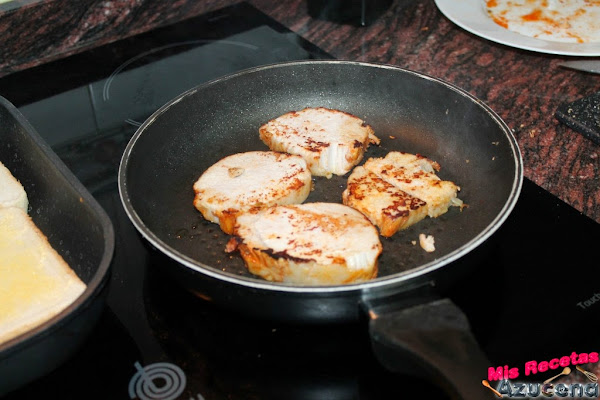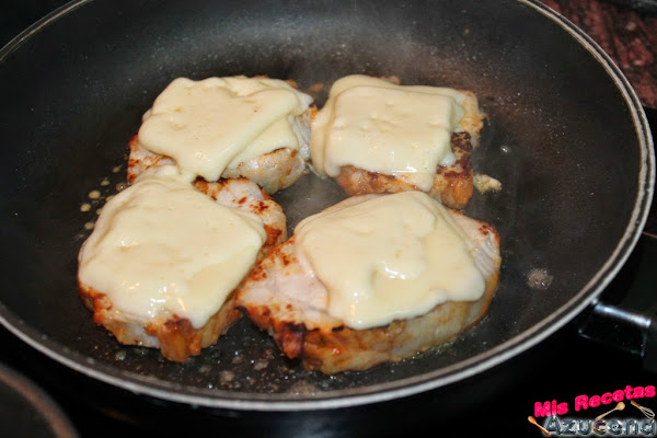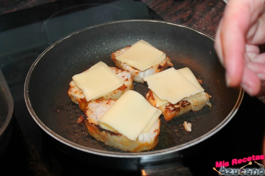 Ponemos una sartén al fuego a fuego medio, ponemos las rodajas de carne y añadimos unas gotas de aceite a cada trozo carne, asamos un minuto por cada lado y ponemos unos trozos de queso por encima, para que el queso se derrita bien añadiremos un chorreón de caldo de carne a la sartén y tapamos.