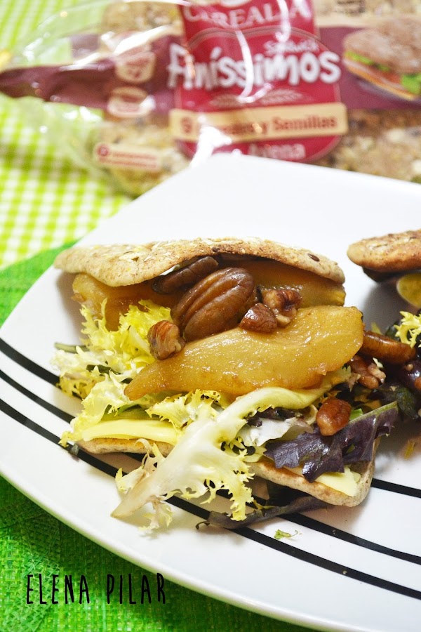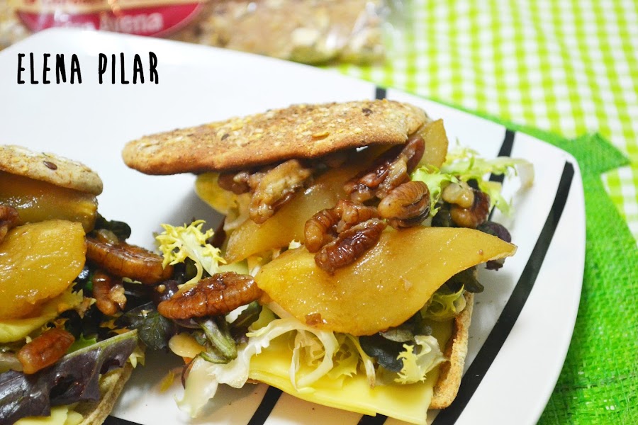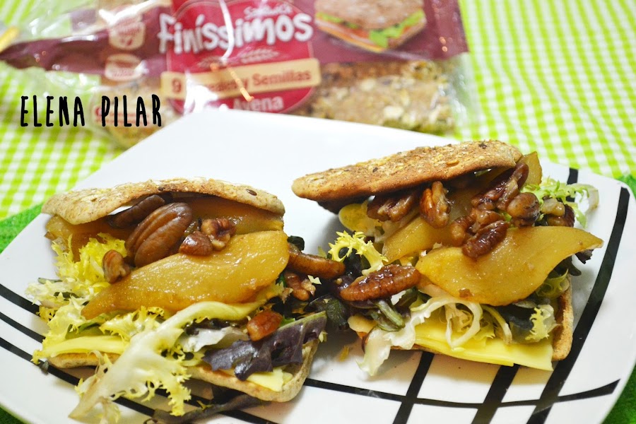 Sándwich de peras asadas a la sidra, nueces pecanas y queso: