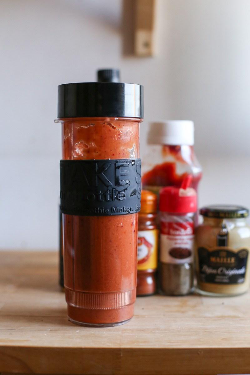 En una procesadora de alimentos o juguera colocar todos los ingredientes de la salsa o adobo (menos el laurel y la cerveza) y triturar hasta obtener una salsa espesa.