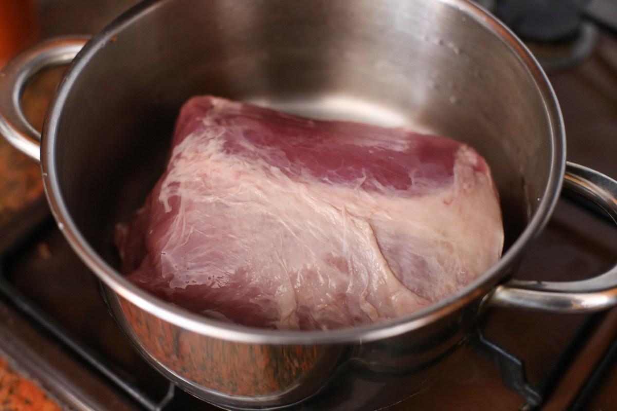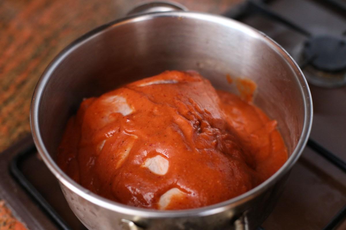 En una olla grande colocar el lomo de cerdo entero y añadir la salsa. Asegurarse de que el cerdo quede bien impregnado en la salsa (usando una cuchara o las manos para que se impregne bien).