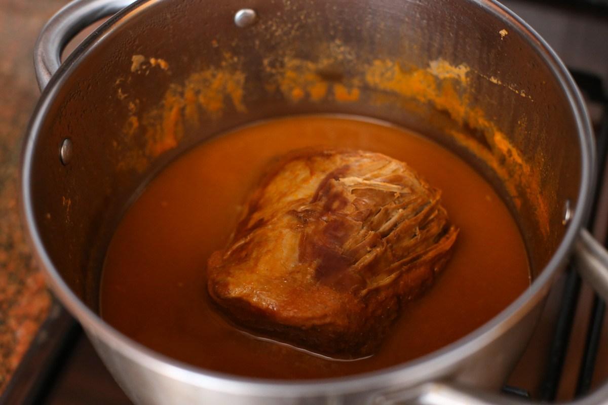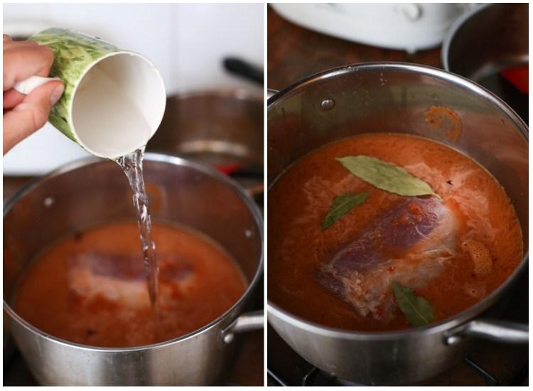 Agregar 4 tazas de agua (aprox 800 ml) y las hojas de laurel. Llevar a ebullición, tapar la olla y bajar el fuego al mínimo. Cocinar durante 3 horas a fuego muy bajo dándole vueltas al cerdo de vez en cuando para que todos los lados del cerdo se impregnen bien en la salsa.
