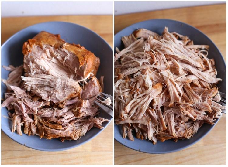 Después de 3 horas de cocción, confirmar que la carne está blanda introduciendo un cuchillo al centro del lomo de cerdo. Si se introduce fácilmente debería estar lista. Sacar el lomo de cerdo (dejar lo que queda de la salsa en la olla) y dejar enfriar durante al menos 10 minutos para luego poder desmenuzar el lomo de cerdo con facilidad con la ayuda de tus manos.
