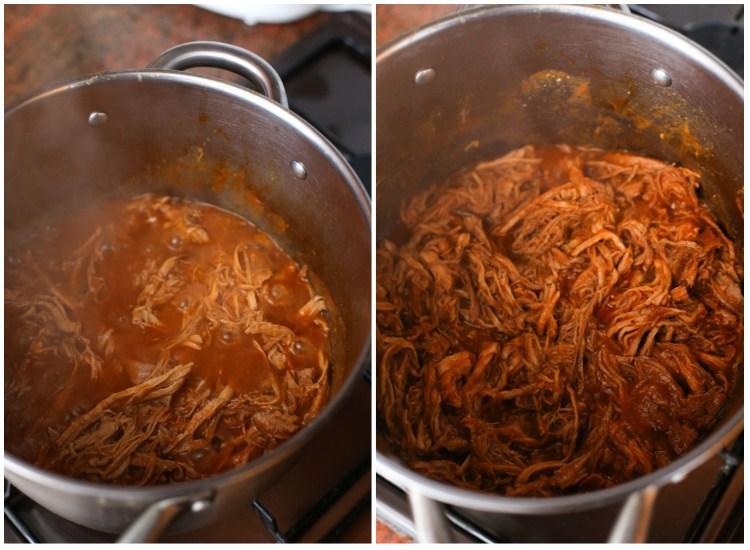 Volver a calentar la salsa que queda en la olla a fuego medio-alto hasta que se reduzca a la mitad (aprox 15 minutos), sacar las hojas de laurel. Aquí puedes agregar un chorrito de cerveza (de cualquier tipo) para darle un toque final. Luego introducir la carne de cerdo desmenuzada en la olla, revolver bien para que se impregne de salsa y calentar a fuego medio-bajo durante aprox 20 minutos más para que el cerdo termine de absorber toda la salsa.