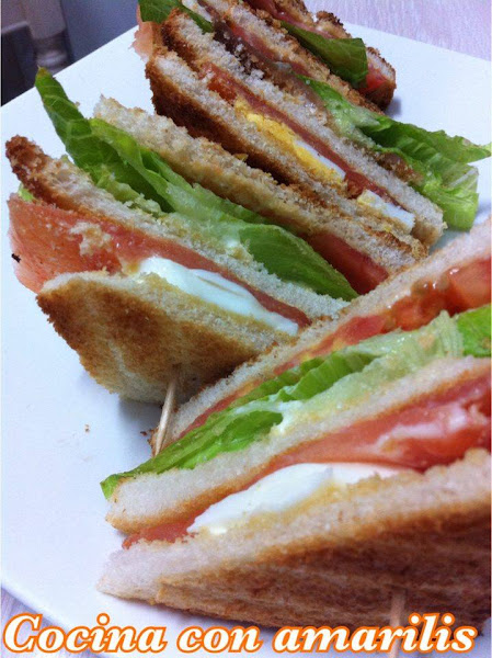 *Tostar el pan , untarle la mayonesa, colocar las rodajas de tomate,la lechuga,un poquito de salmón, una rebanada de pan,mayonesa, mas salmón, pepinillo, aguacate, el huevo, 2 trozos mas de lechuga y la otra rebanada de pan,
