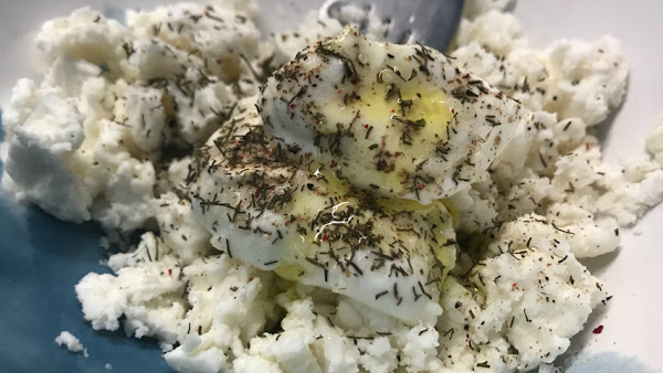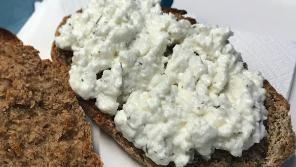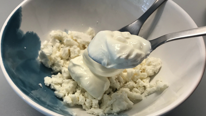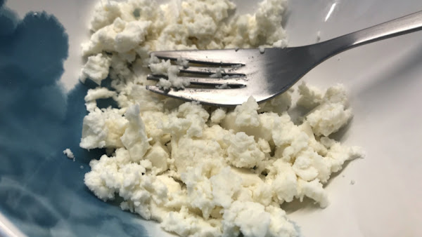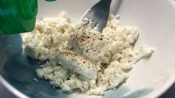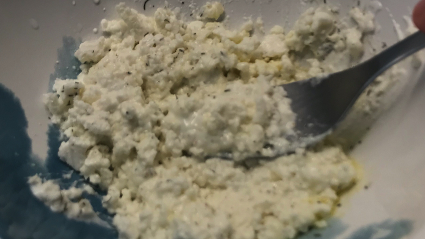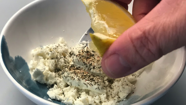 En un bol pon un trozo de queso fresco y aplástalo con un tenedor. Añade un par de cucharaditas de yogur griego, sal, pimienta, eneldo, zumo de limón y unas gotas de aceite de oliva. Mezcla bien.