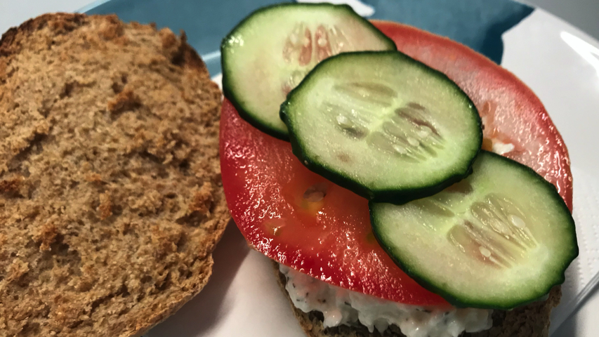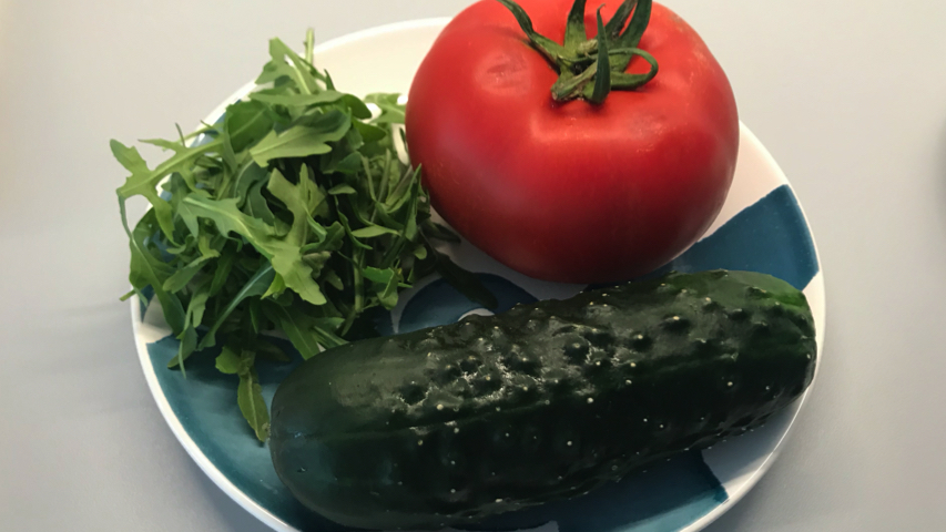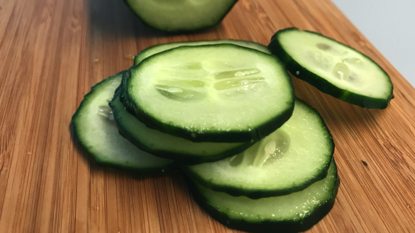 Limpia el pepino y el tomate y sécalos. Córtalos en rodajas finas.