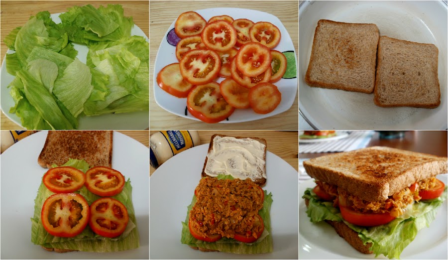 Finalmente, montamos cada sándwich colocando una o dos hojas de lechuga sobre una tajada de pan, seguimos con las rodajas de tomate y terminamos con el salpicón de bonito. Esparcimos una generosa capa de mayonesa en la otra rebanada de pan y tapamos. Servimos inmediatamente.