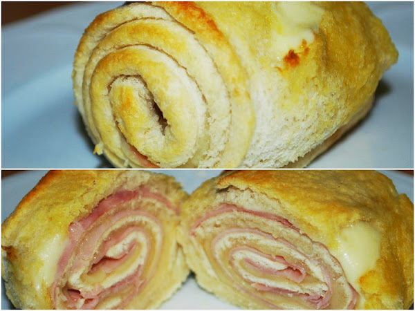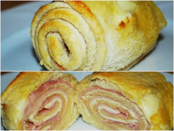 Enrollamos (foto 4ª). Derretimos mantequilla y pincelamos cada rollo.