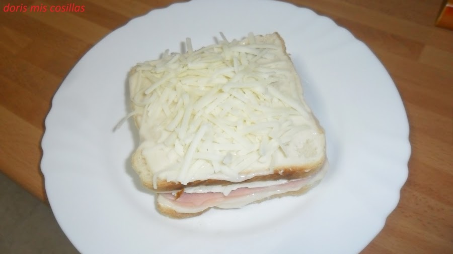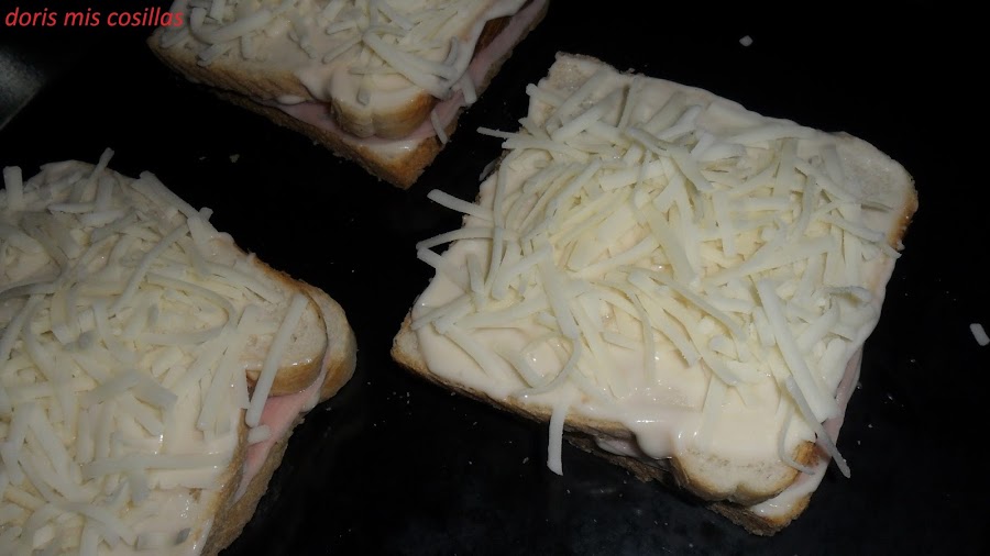 Con una espátula, huntamos 4 lonchas de pan de molde con la bechamel, espolvoreamos con el queso, encima de esta el jamón cocido y el queso en loncha. Huntamos otra rebanada de pan con salsa y cerramos el sanwich. Por último,rematamos huntando generosamente la superficie con mas salsa bechamel y queso rallado...así con todos. Los llevamos al horno hasta verlos doraditos con el queso bien fundido.