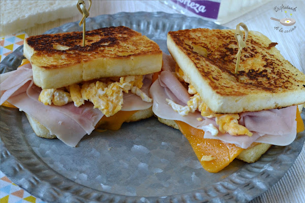 Después de dorar las rebanados por los dos lados, nos dispondremos a montar nuestro sándwich. Sobre la rebanada que será la base pondremos el queso cheddar el pavo y el jamón, y por encima los huevos revuelto. Cerraremos con la otra rebanada y pincharemos nuestro sándwich con un palillo para que no se abra. Y ya lo tenemos listo para servir.