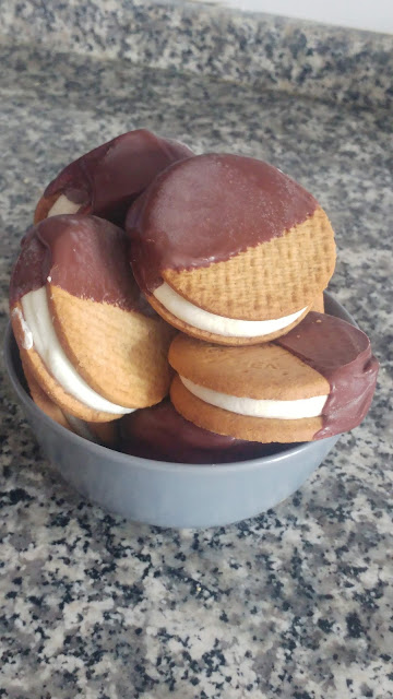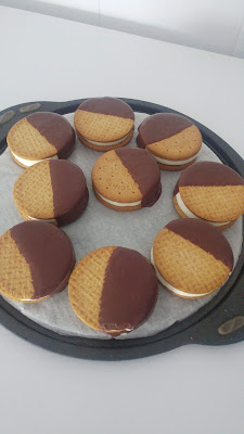 Preparamos la cobertura con la misma cantidad de nata (crema de leche) y chocolate. En este caso 150 grs de nata (crema de leche) y 150 grs de chocolate. Calentamos la nata (crema de leche) y al primer hervor retiramos y mezclamos con el chocolate en trocitos. Se trata de cubrir media galleta pero si os apañais para cubrirla entera mejor que mejor... Dejamos enfriar un poco y bañamos la mitad de la galleta.