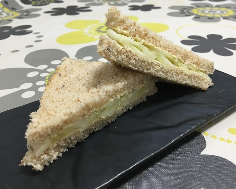 - Coloca las rodajas de pepino sobre toda la superficie de dos de las cuatro rebanadas.