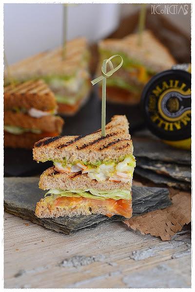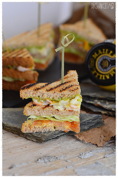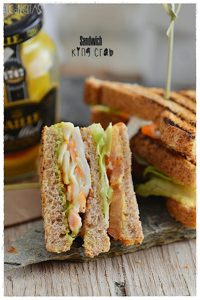 Realizamos la mezcla de mostaza con la mahonesa, haciendo lo mismo con los palitos de cangrejo y la mahonesa restante. Tostamos el pan ligeramente y empezamos a montar nuestro sandwich