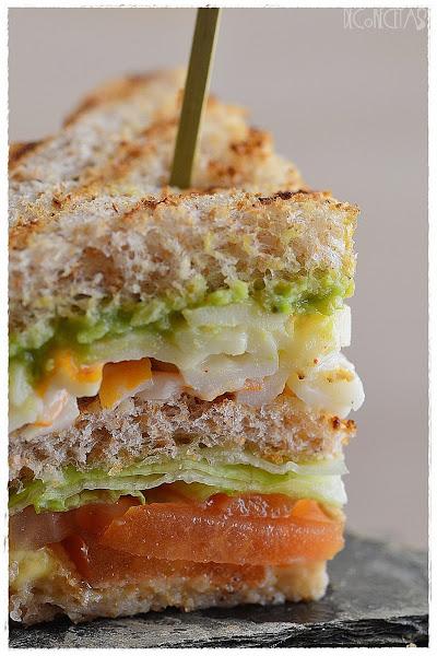 Untamos la primera rebanada con la mezcla de mahonesa con mostaza, ponemos tomate encima hasta completar toda la rebanada, lechuga, y tapamos con la segunda rebanada. Extendemos la mezcla de palito de cangrejo con mahonesa añadiendo pimentón dulce justo encima. Por último, untamos con guacamole la última tostada de pan que ponemos justo encima del pan con cangrejo.