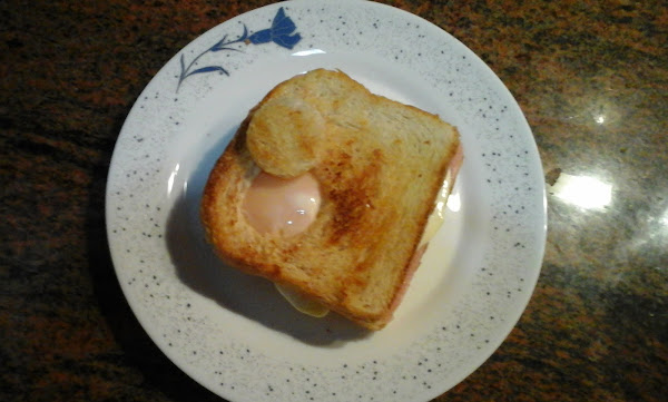 Mientras tanto en otra sartén o en una plancha freímos el huevo, escurrimos el aceite y lo sacamos a un plato. Una vez que ya está dorado el pan de sándwich y se ha derretido el queso quitamos la rebanada que tiene el agujero y colocamos el huevo de tal manera que el círculo que le hemos hecho quede encima de la yema. Y ya está listo para comer.