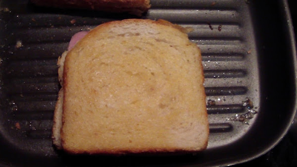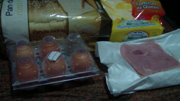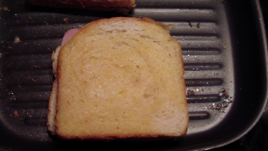 Ahora toca montar los sándwich, colocamos la loncha de queso y encima la de jamón en la rebanada que no tiene agujero, tapamos el sándwich con la rebanada del agujero y comenzamos a tostarlo en una sartén por ambos lados.