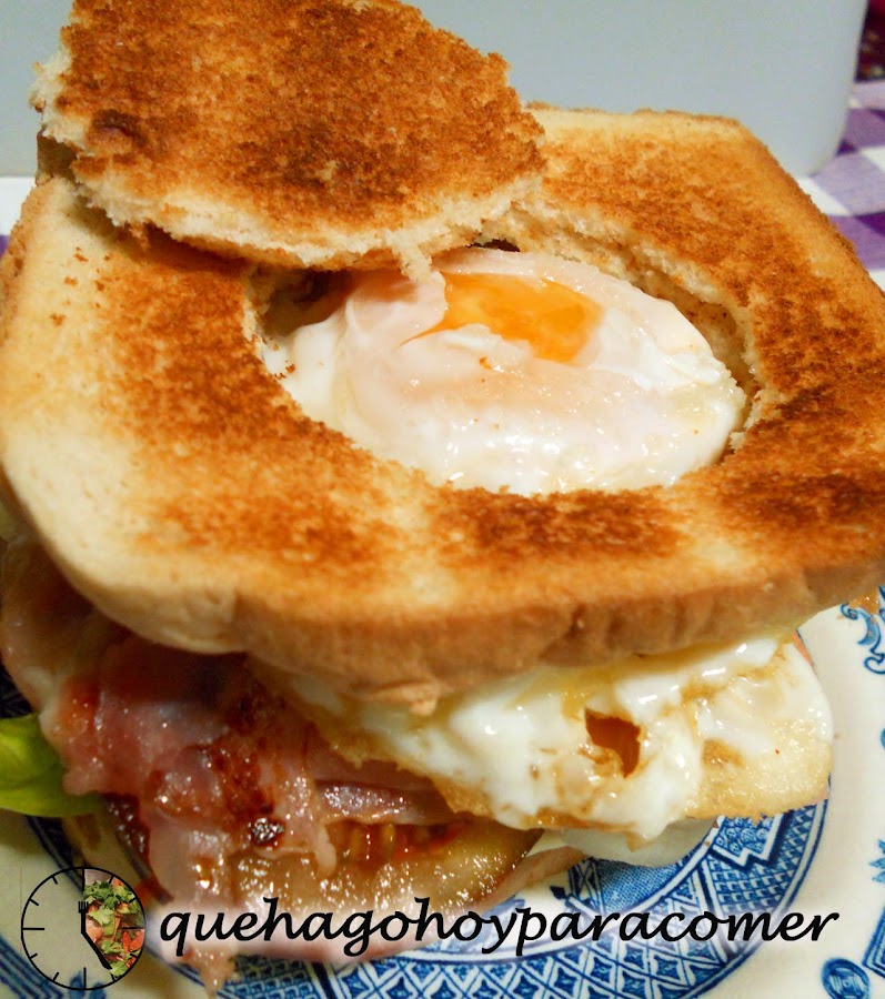 Con ayuda de un vaso de chupito, o con un molde de galletas, recortamos un circulo que sea más o menos el de la circunferencia del huevo de la última rebanada de pan y la colocamos sobre el sandwich. Y tenemos la cena lista.