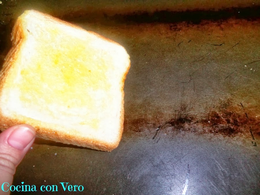 1/ Untamos una de las caras de los panes con aceite con la ayuda de una brocha de silicona y lo colocamos en la plancha.