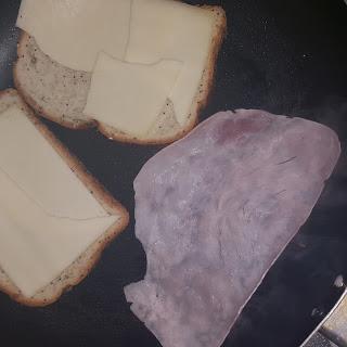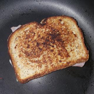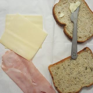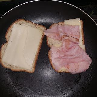 Ponemos sobre el pan el queso y el jamón pasado por la plancha. Montamos el sándwich con la ayuda de una espumadera.