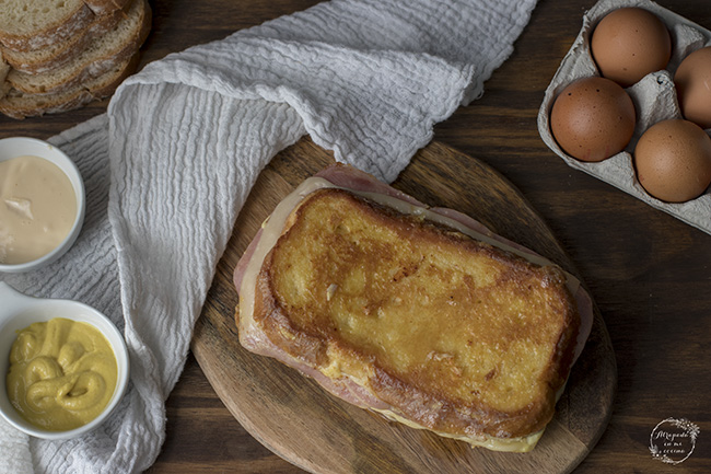 PREPARACIÓN:Mezclamos la mayonesa con la mostaza, untamos una rebanada de pan de molde con la mezcla, encima ponemos dos lonchas de jamón York y un loncha de queso. Untamos otra rebanada de pan de molde con la mezcla de mayonesa y mostaza, tapamos la anterior rebanada, dejando la parte untada por encima. Ponemos dos lonchas de jamón de pavo y encima una de queso. Tapamos con la última rebanada. Pasamos el sándwich por huevo batido, procurando que quede impregnado por todos lados.
